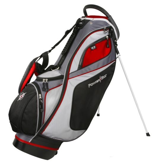 The Powerbilt Dunes USA Flag Stand Bag features quality construction and design targeted to the all-around golfer. Features: 9 inch, 6 way graphite friendly separator top, 3 full length club / shaft dividers, Convenient bottom lift handle, 5 zippered pockets including a velour lined valuables pocket and cooler pockket, Padded double carry strap and hip pad, Tee holder, scorecard sleeve, umbrella holder, rain hood cover and towel ring with Velcro glove attachment, Easy release, tempered stand legs, Velcro strap closure secures stand legs when not in use, Constructed from light weight dobby nylon materials, 5.4 lbs